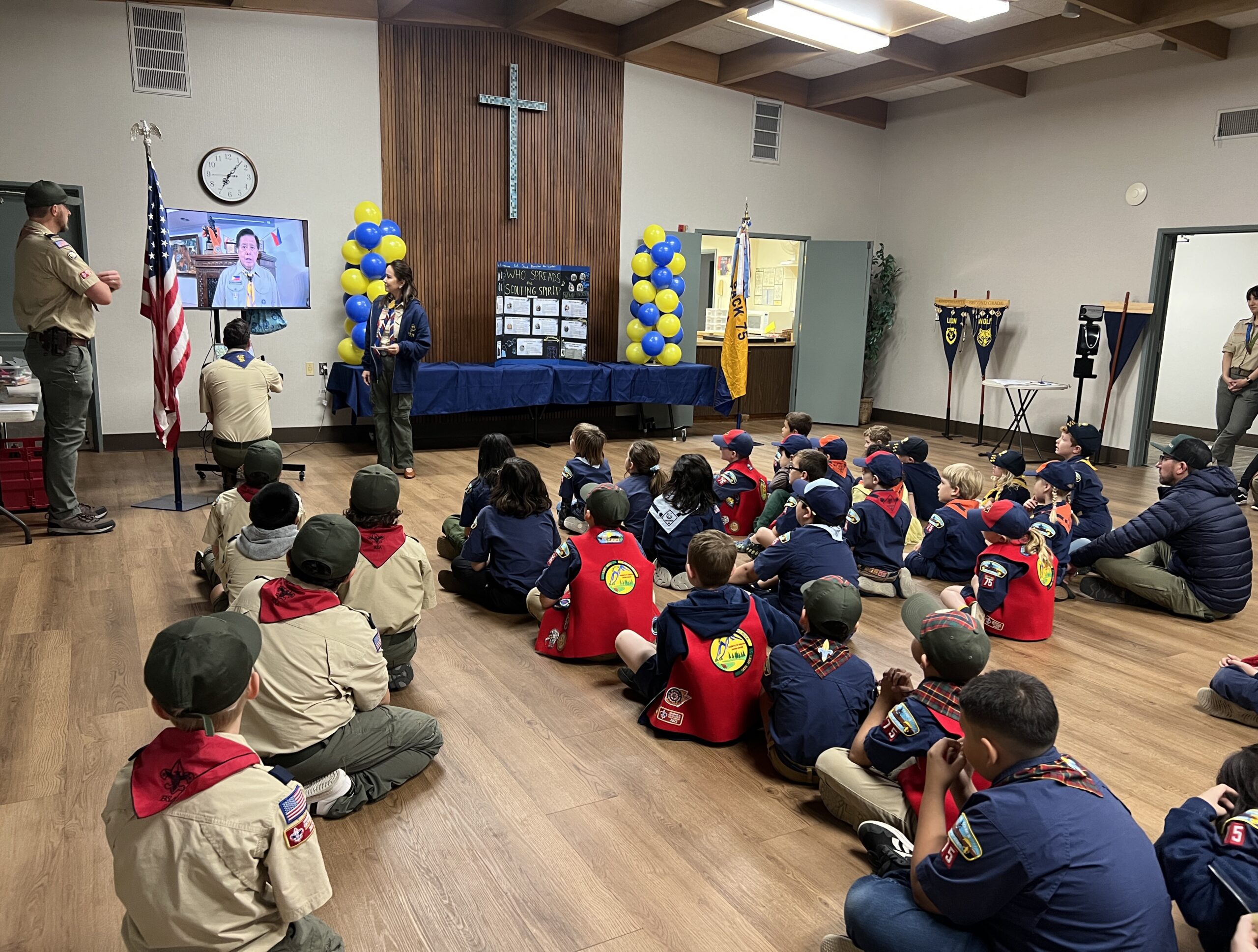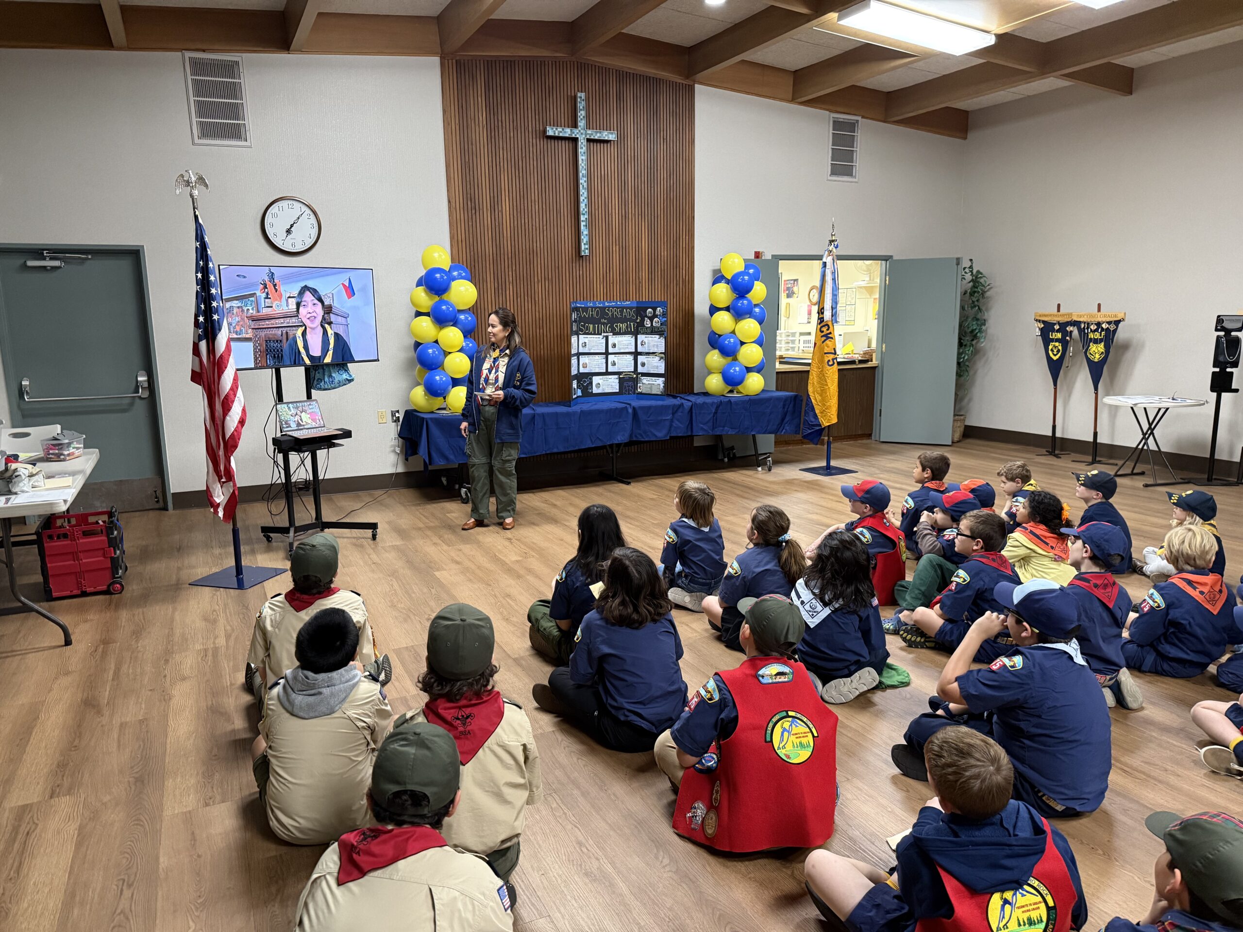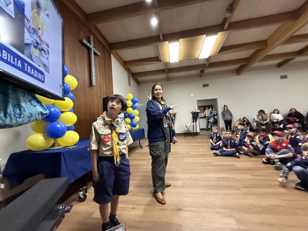 The AOL den also gave a great presentation on the history of scouting, with some information about the founders and their contributions to the organization. The scouts were also treated to a slideshow of photos from the 33rd Asia-Pacific Regional Scout Jamboree, where one of our families was honored to participate.