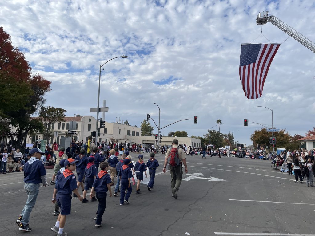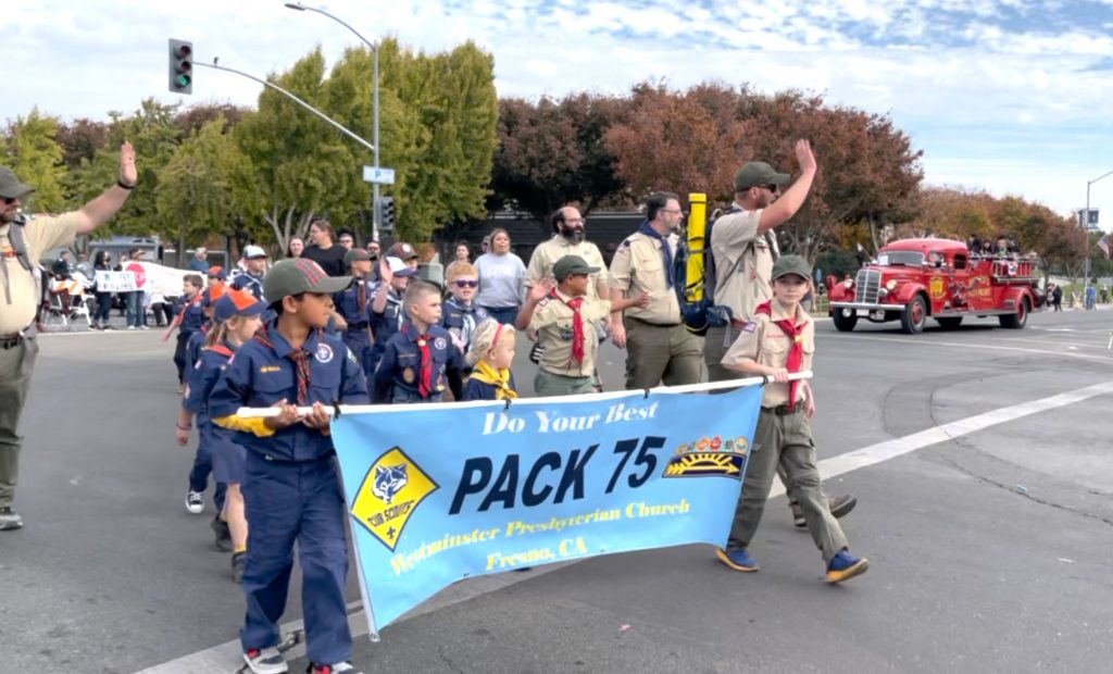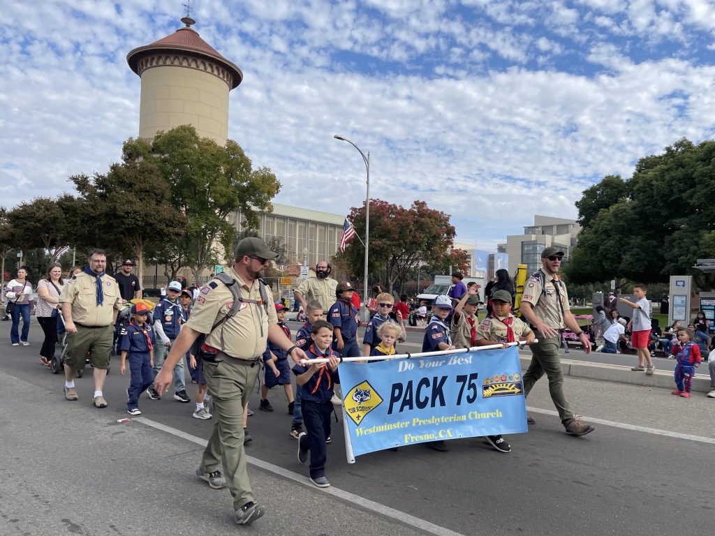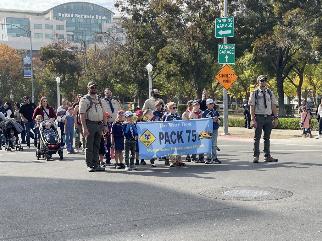 Pack 75 represented well at the 105th Annual Veterans Day parade in downtown Fresno! The scouts learned a valuable lesson- parades are never on time. They also got a nice earful of that 1939 Me ‘N Ed’s firetruck. But they enjoyed carrying the banner and waving to the crowd, finishing just before the weather turned.