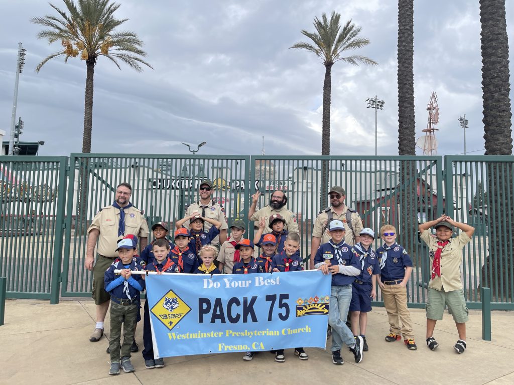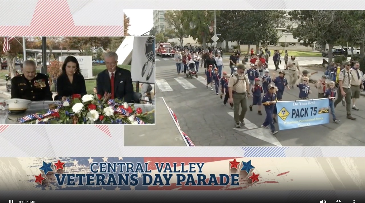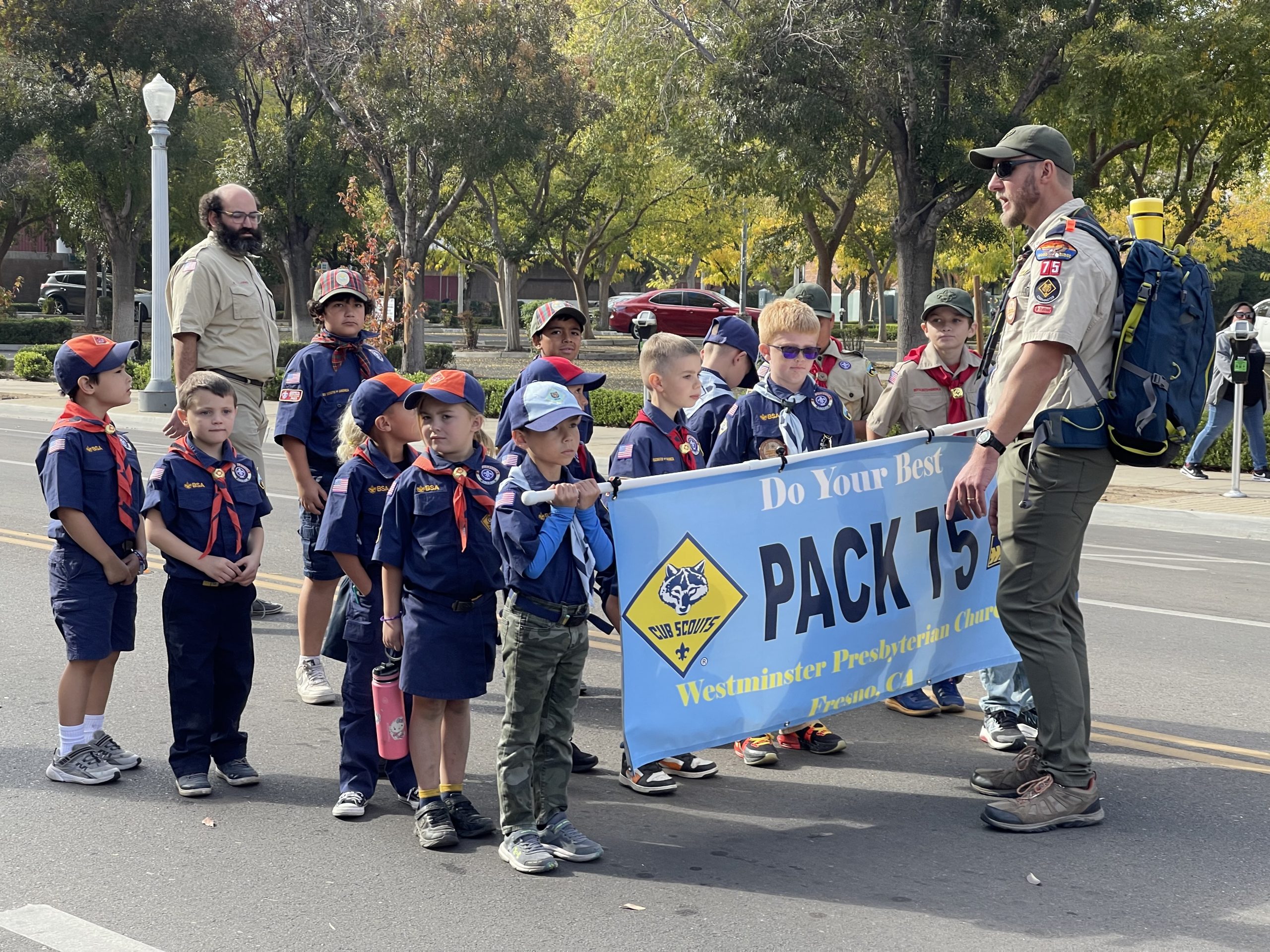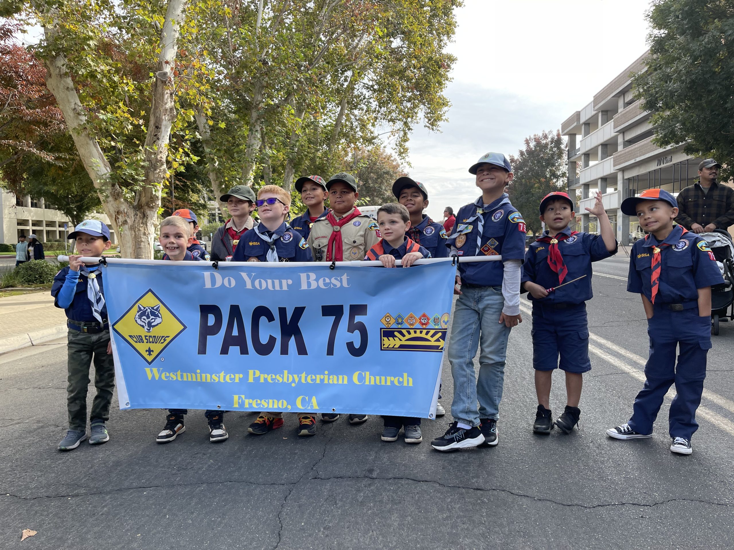 Pack 75 represented well at the 105th Annual Veterans Day parade in downtown Fresno! The scouts learned a valuable lesson- parades are never on time. They also got a nice earful of that 1939 Me ‘N Ed’s firetruck. But they enjoyed carrying the banner and waving to the crowd, finishing just before the weather turned.