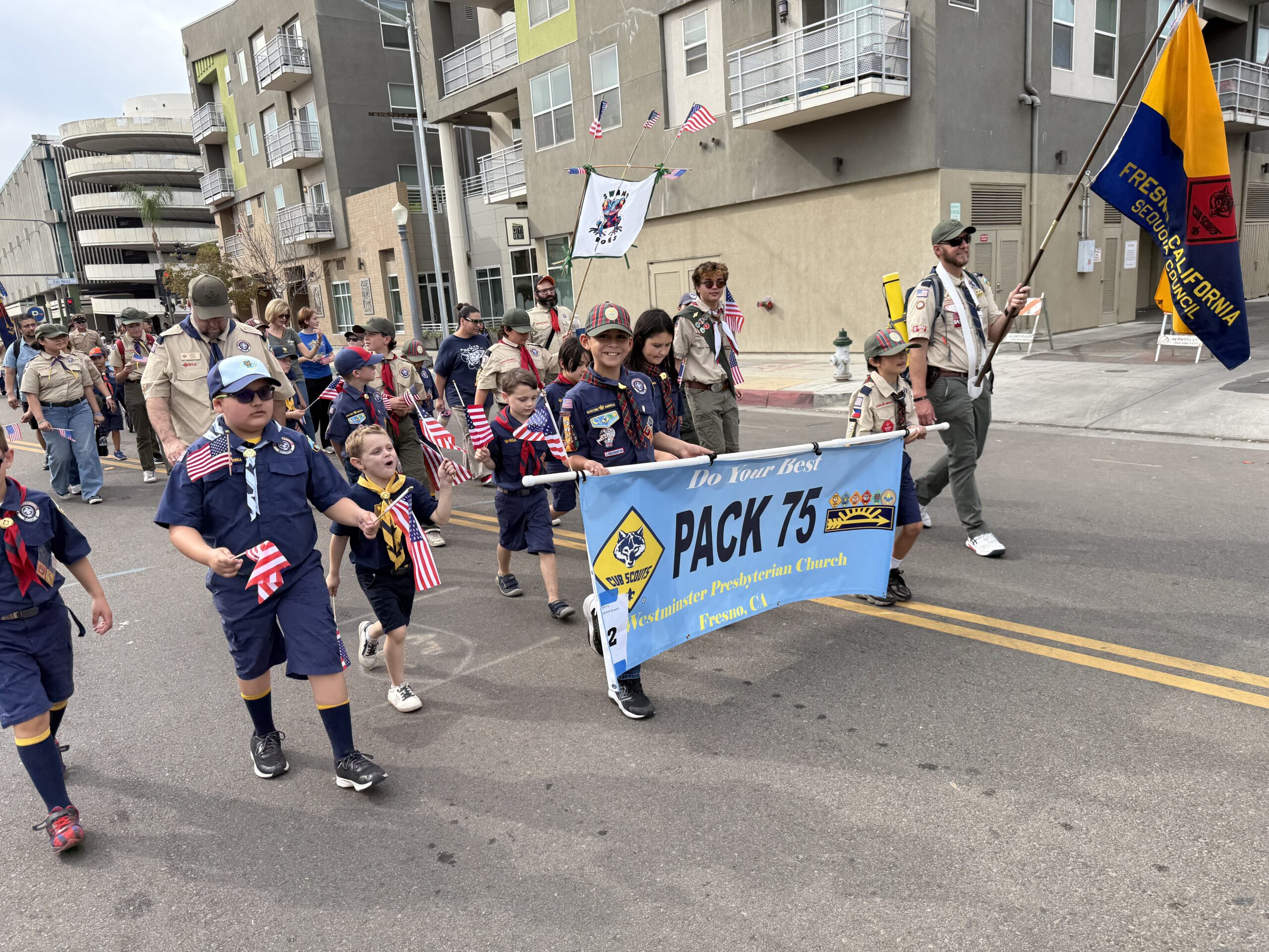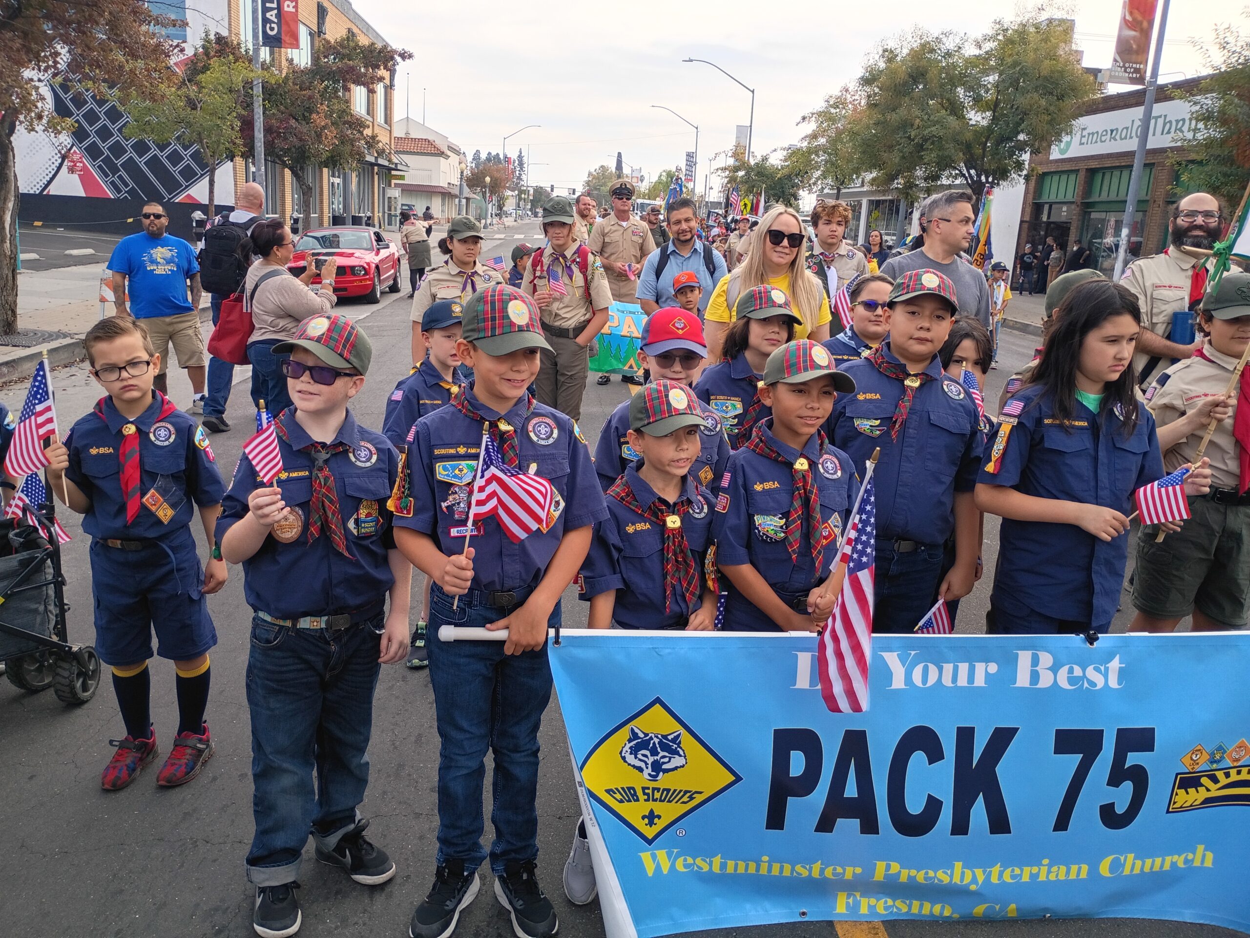 Once again Pack 75 participated in the annual Veterans Day Parade in Downtown Fresno, honoring some of our nation’s heroes. This year the Scouts were joined by other great units from the Sequoia Council to really show a strong Scouting spirit in this year’s parade.